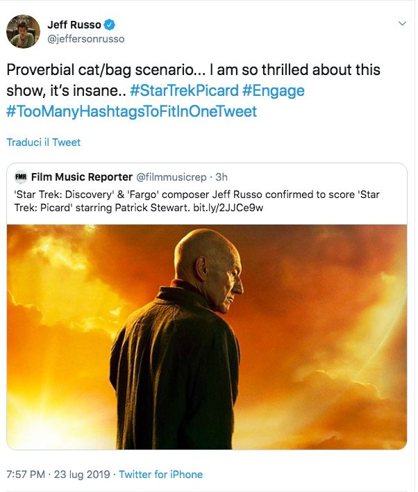 È lo stesso compositore della prima e della seconda Stagione di Star Trek Discovery e oggi grazie ad un suo Tweet rilasciato dal suo profilo personale, abbiamo scoperto che lo stesso è stato scelto per accompagnare le scene di Picard; la nuova serie Trek che debutterà su Amazon Prime Video nei primi del 2020, stiamo parlando di Jeff Russo.